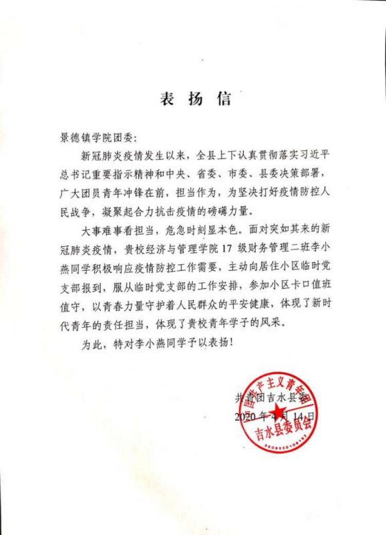(本网讯:徐欣鹏)近日,校团委收到来自共青团吉水县委的表扬信,对积极参与新冠肺炎疫情防控工作的beat365官网学子李小燕予以表扬。 信中写到“大事难事看担当,危机时刻显本色。李小燕以青春力量守护着人民群众的平安健康,...