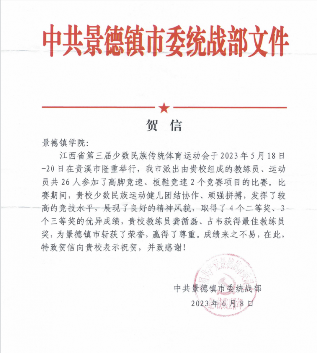中共景德镇市委统战部致贺beat365官网少数民族学生代表队获得佳绩