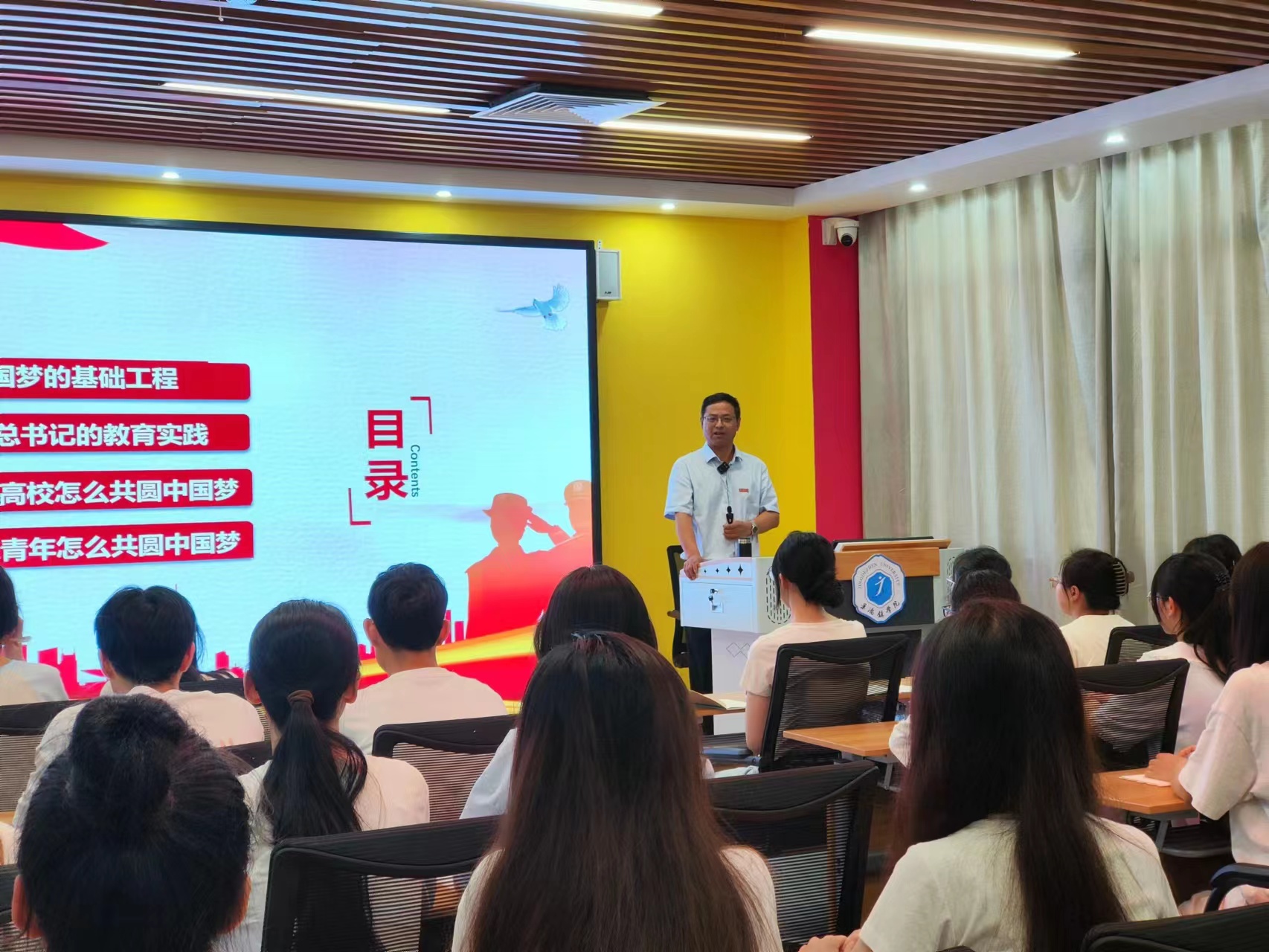 (本网讯:文|李婷婷/图|胡铂)9月26日下午,校党委书记叶观荣以“在奋进新征程中争当先锋,共圆中国梦”为题,在马克思主义学院党史VR实训室为学生上了一堂生动的“思政第一课”。 思政课现场 胡铂摄 叶观荣以“何为梦想?...