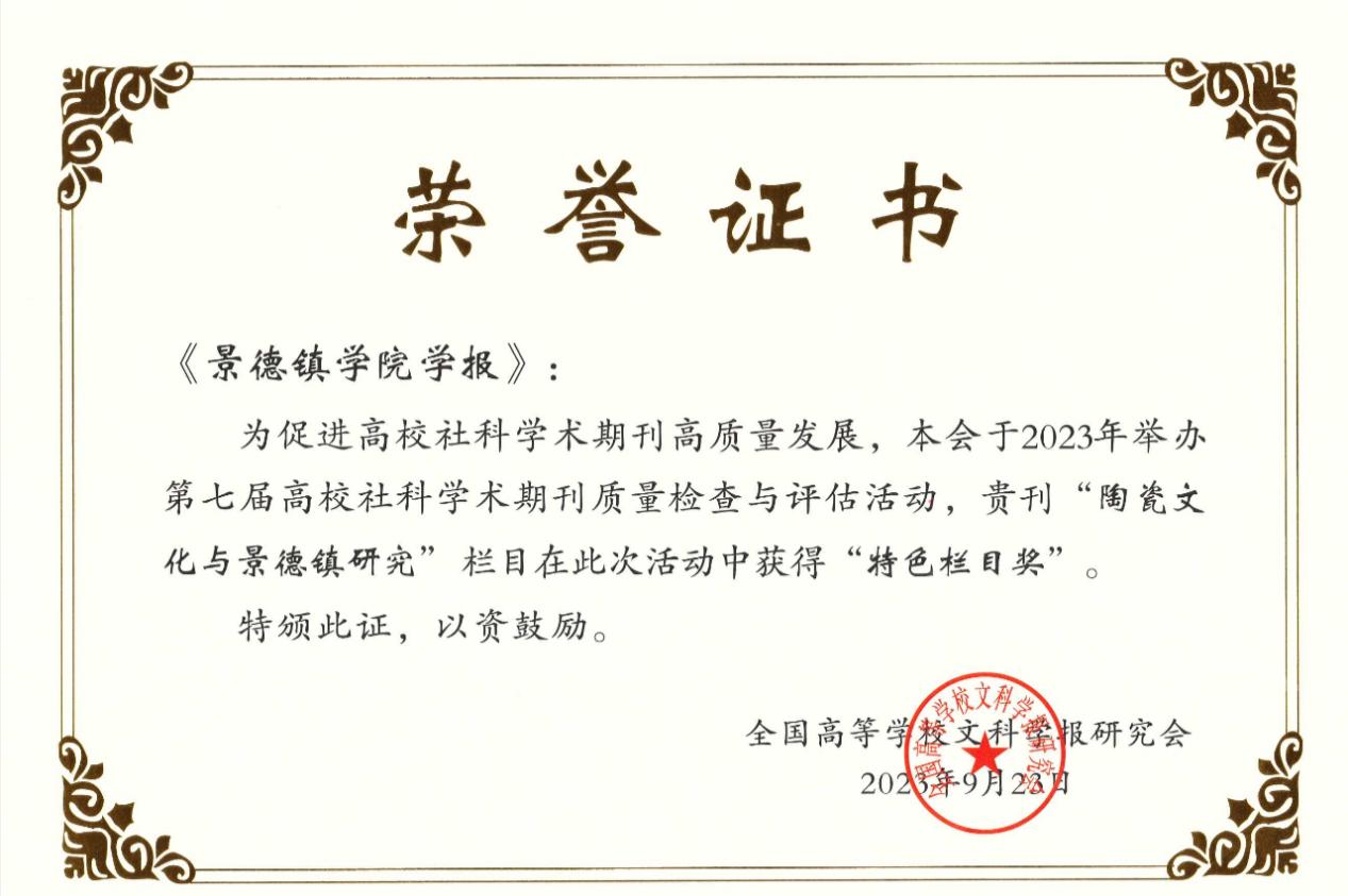 【喜报】《英国beat365官方网站学报》“陶瓷文化与景德镇研究”栏目首次获得全国“特色栏目奖”