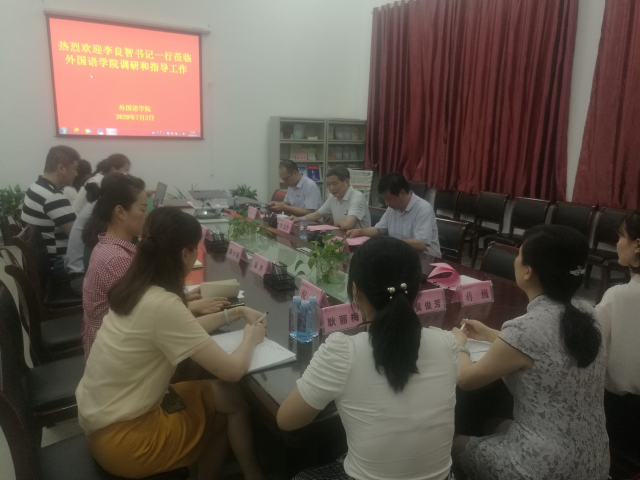 (本网讯:外国语学院)7月2日下午,党委书记李良智在党委委员、组织部长朱贺江陪同下到外国语学院调研指导工作。 外国语学院党总支书记郭小丽,行政负责人朱练平就党建、教学科研、专业建设、学科建设、人才培养等方面作了汇报。...