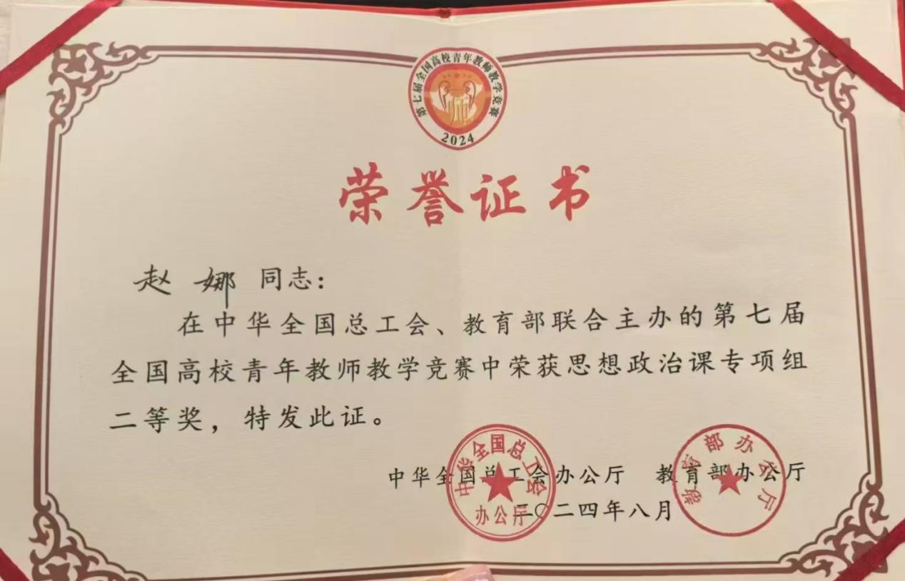 (本网讯:余洪权)8月26至30日,由中华全国总工会、教育部联合主办,中国教科文卫体工会、教育部教师工作司联合承办的第七届全国高校青年教师教学竞赛决赛在上海交通大学成功举办。beat365官网马克思主义学院青年教师赵娜荣获思想政治专项组二等奖,...