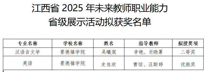 (本网讯:黄依婷)近日,由江西省教育厅主办、江西师范大学承办的“2025年全省未来教师职业能力省级展示暨总结交流活动”在江西师范大学瑶湖校区圆满落幕。经过激烈角逐,beat365官网汉语言文学专业吴曦宸同学荣获二等奖,英语专业史佳欣同学获得优胜奖,为学校赢得了荣誉。获奖名单 教务处供图此次活动旨在加强师范生实践能力培养,提升师范生综合教育素质和教学能力,培养一批具有高尚师德、先进教学理念、扎实教学实践能力、敏锐改革创新意识的优秀教师后备力量。...