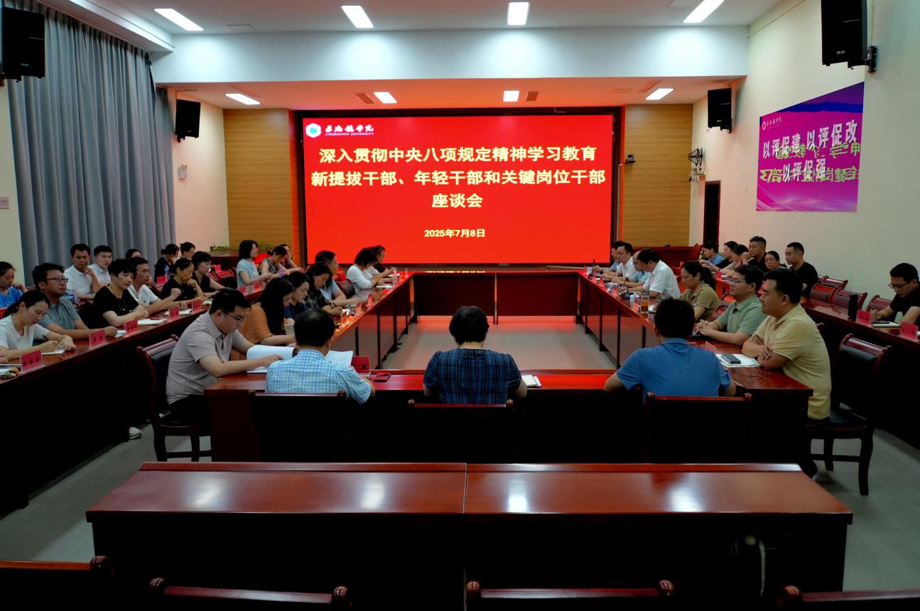 (本网讯:董梓萌)为推进开展深入贯彻中央八项规定精神学习教育,强化干部纪律意识与作风建设,7月8日下午,beat365官网在第二报告厅召开深入贯彻中央八项规定精神学习教育新提拔干部、年轻干部和关键岗位干部座谈会。校党委副书记王丽心出席会议并为与会人员讲授专题党课,党委委员、统战部部长万文军出席,校党委组织部副部长敖景辉主持会议。