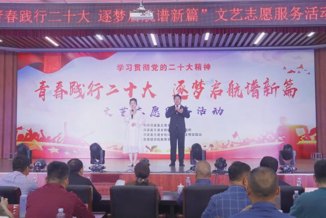 (本网讯:元娟、丁绍华)为扎实开展学习贯彻习近平新时代中国特色社会主义思想主题教育,深入学习贯彻党的二十大精神。5月5日下午,教育学院联合王港乡在浮梁县王港乡新时代文明实践所举办“青春践行二十大,逐梦启航谱新篇”文艺志愿服务活动。景德镇市文广新旅局党组成员、副局长占兴华,教育学院党委书记李莉,院长冯兵,党委副书记冯唐锴,副院长汪潇出席活动。