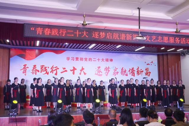活动分为党的二十大精神文艺演出和有奖知识问答小互动。演出在悠扬动听、情绪层次丰富的大合唱《花开忘忧》中拉开帷幕。随后,诗朗诵《美哉诗经》、舞蹈《我爱你中国》等九个节目轮番上演,最后,在合唱《我像雪花天上来》动听的旋律和观众热烈的掌声中